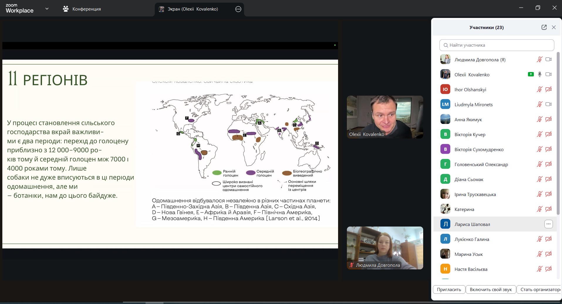 Лектор детально охарактеризував основні класифікаційні схеми центрів доместифікації – від класичних, розроблених Миколою Вавиловим, до новітніх, заснованих на молекулярно-генетичних дослідженнях. Було презентовано порівняльний аналіз різних підходів до визначення центрів походження культурних рослин і наведено їх конкретні приклади із давніх центрів Азії, Африки, Америки та Середземномор’я.