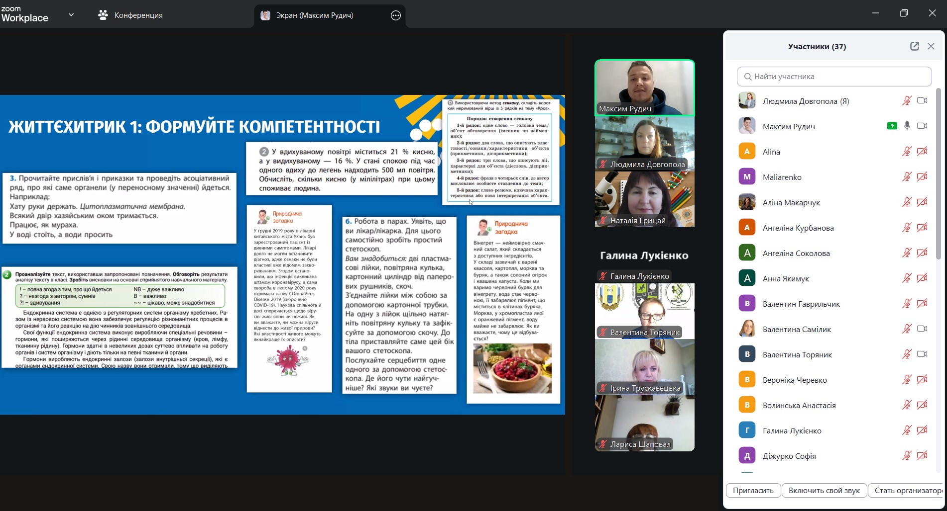 - інструменти діяльнісного підходу, які перетворюють навчання біології на дослідження, дають можливість учнівству експериментувати, створювати моделі, обговорювати й відкривати. Спікер продемонстрував приклади авторських розробок: моделі органів, інтерактивні макети, проєкти, лабораторні роботи, цифрові інструменти доповненої реальності. «Біологія оживає тоді, коли дитина може торкнутися, побудувати, змоделювати, змінити. Дія – це завжди шлях до розуміння», – зазначив Максим.