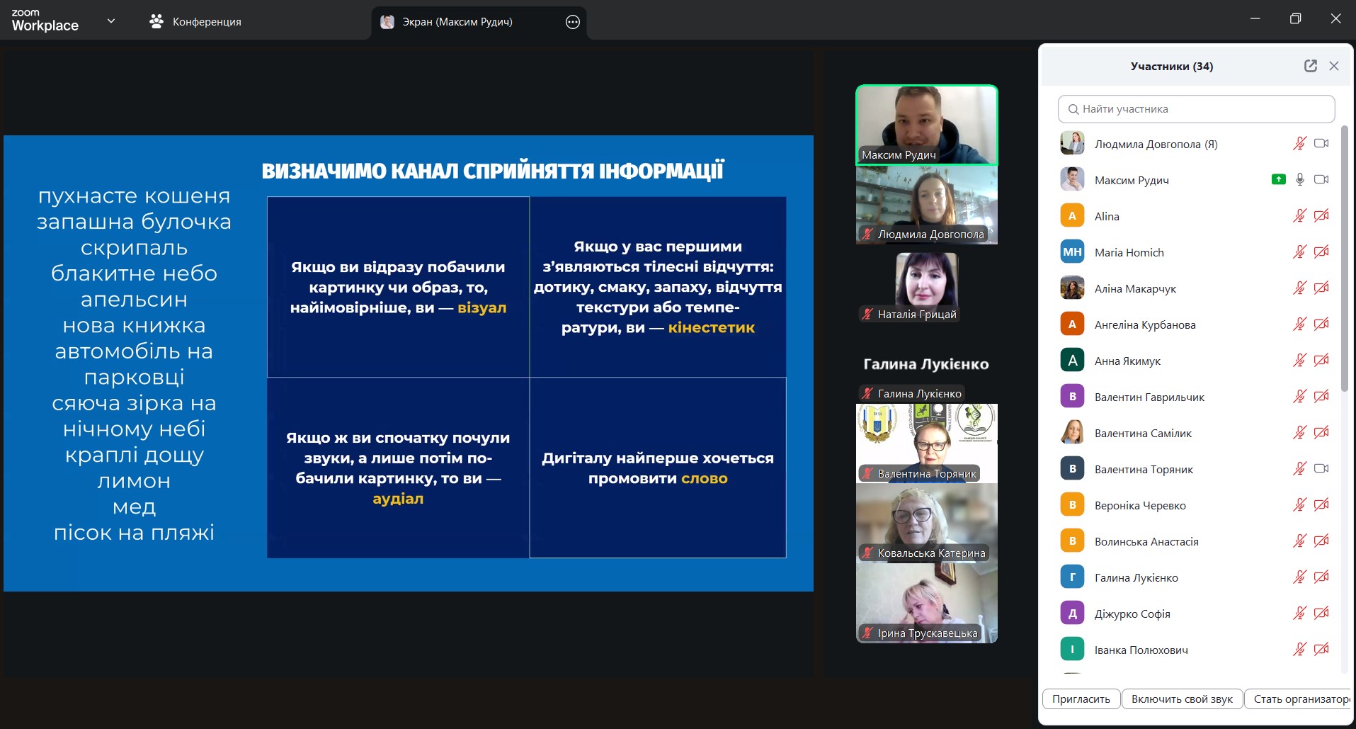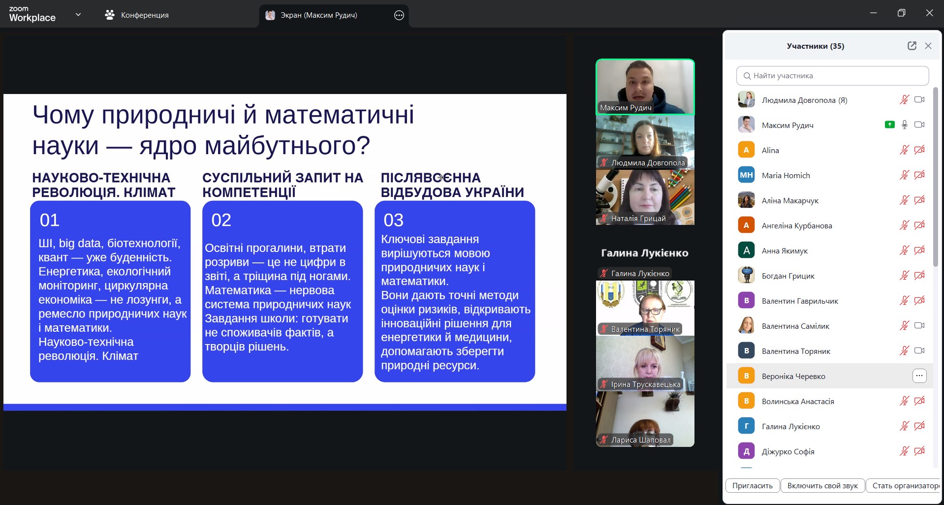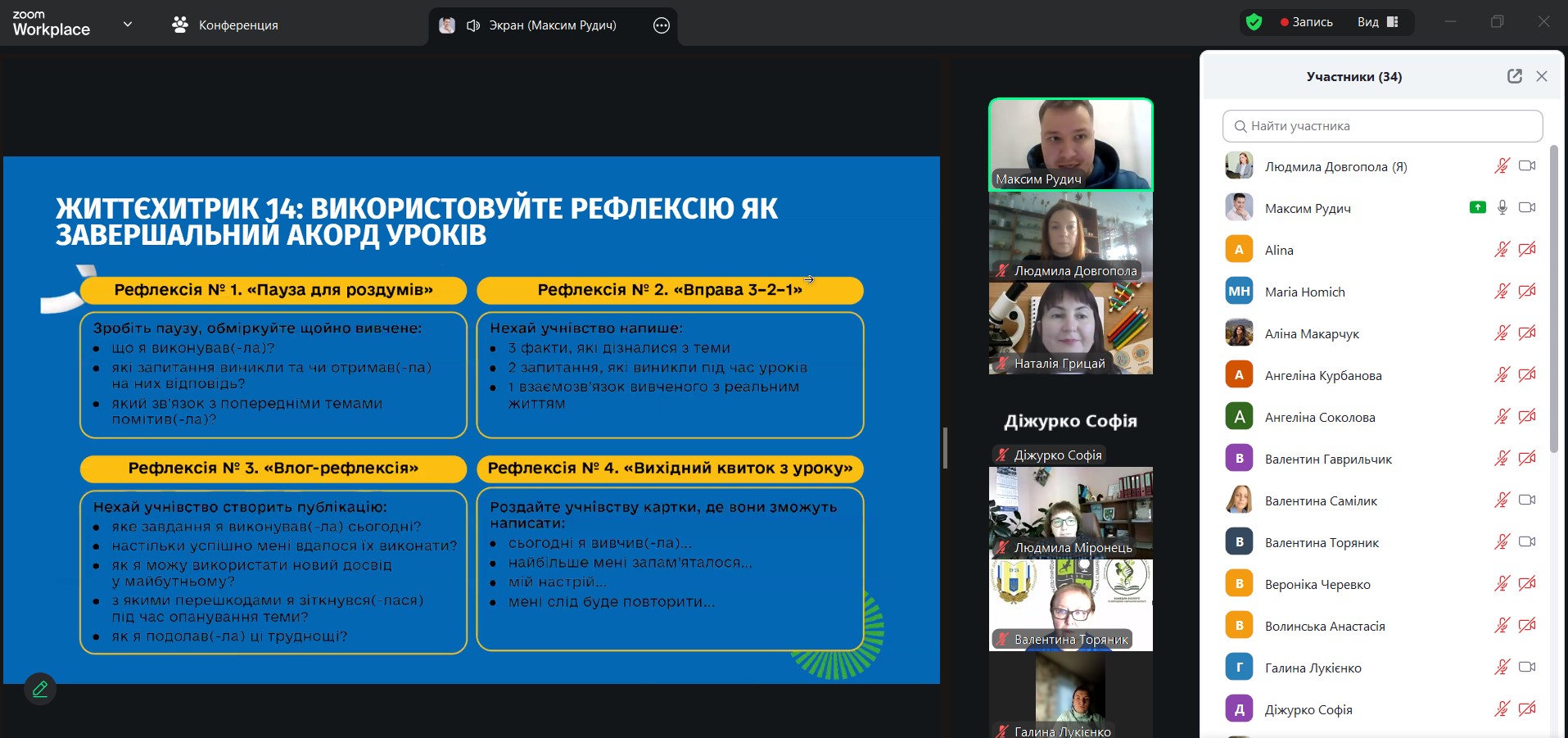 - як подавати навчальний матеріал короткими, логічними порціями, аби учнівство краще засвоювало складну біологічну інформацію. Спікер наголосив «Розділяйте великий обсяг на короткі сегменти. Після кожного – зупиніться й дайте здобувачам освіти час проговорити почуте. Так матеріал перестає бути інформаційним шумом і стає знанням». Максим Рудич продемонстрував, як короткі паузи для запитань і рефлексії підсилюють ефективність викладання і зменшують інформаційне перевантаження учнівства на уроці біології;