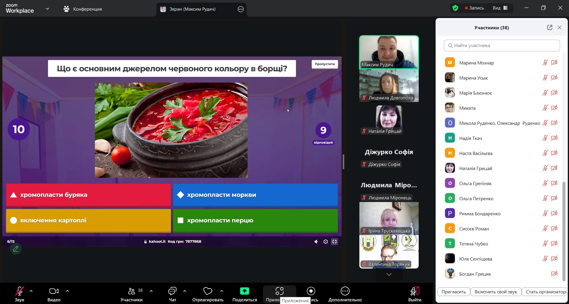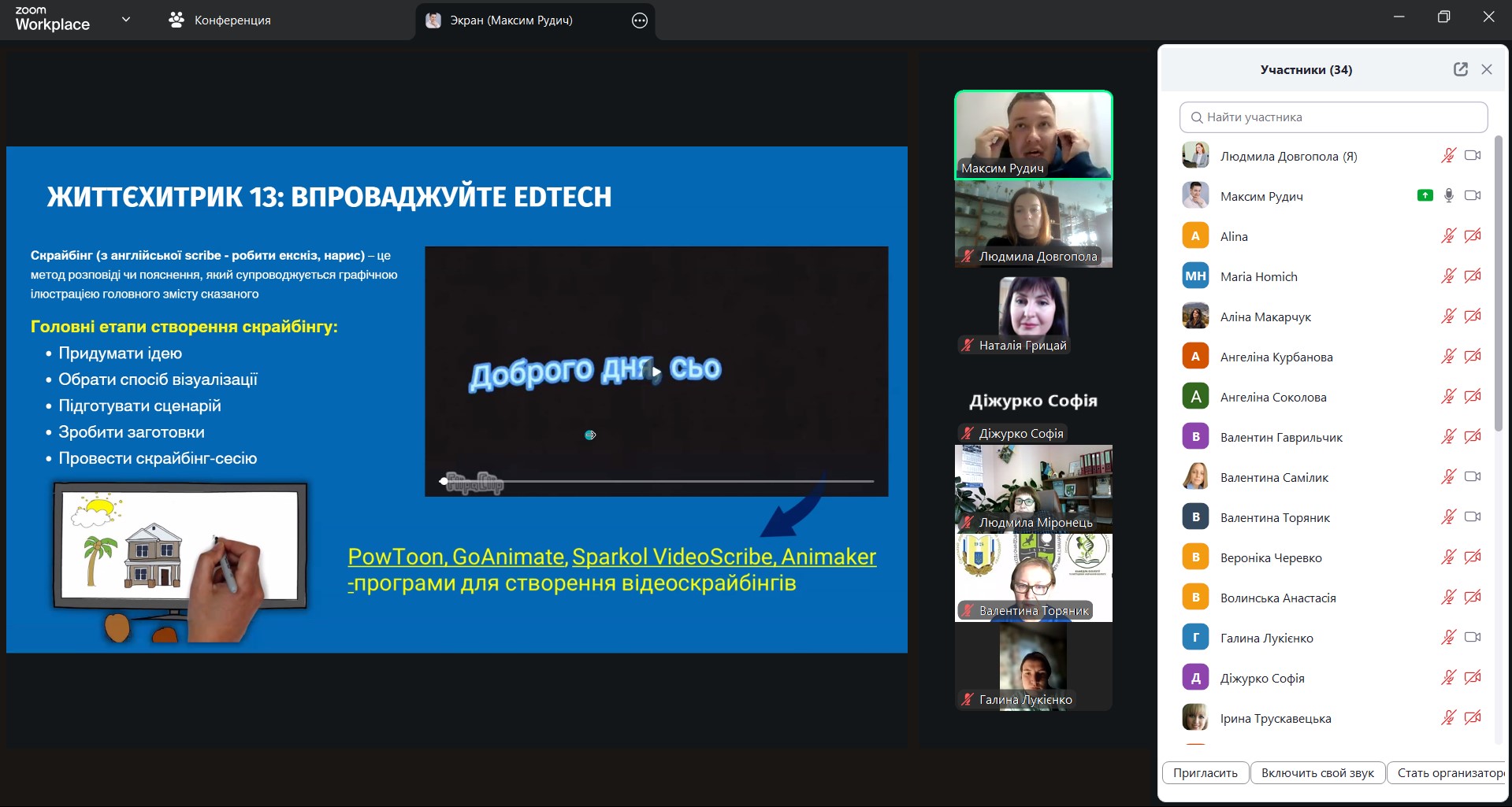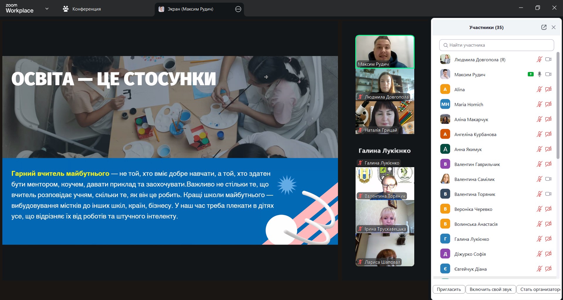 - як подавати навчальний матеріал короткими, логічними порціями, аби учнівство краще засвоювало складну біологічну інформацію. Спікер наголосив «Розділяйте великий обсяг на короткі сегменти. Після кожного – зупиніться й дайте здобувачам освіти час проговорити почуте. Так матеріал перестає бути інформаційним шумом і стає знанням». Максим Рудич продемонстрував, як короткі паузи для запитань і рефлексії підсилюють ефективність викладання і зменшують інформаційне перевантаження учнівства на уроці біології;