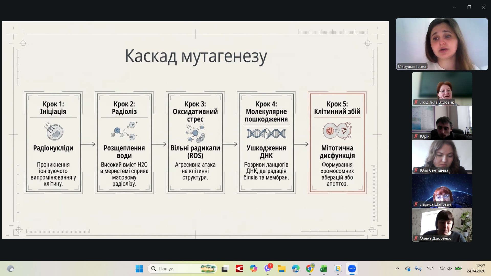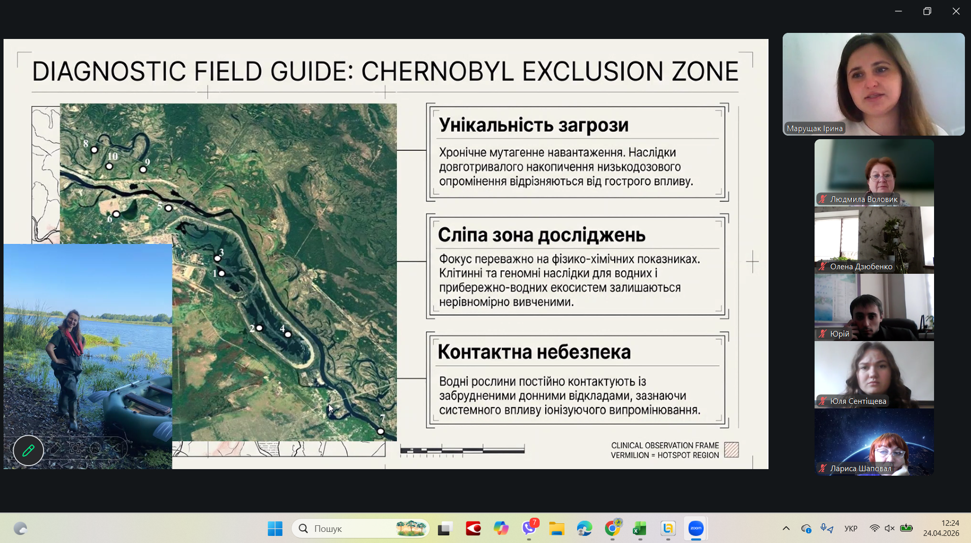 Натомість викладачка кафедри природничих дисциплін і методики навчання Ірина Марущак присвятила свій виступ темі «Цитогенетичні аномалії в меристематичних тканинах вищих водних рослин Чорнобильської зони відчуження як маркер радіоактивного забруднення водойм», окресливши роль водних рослин як ключових біоіндикаторів для моніторингу екологічного стану регіону.