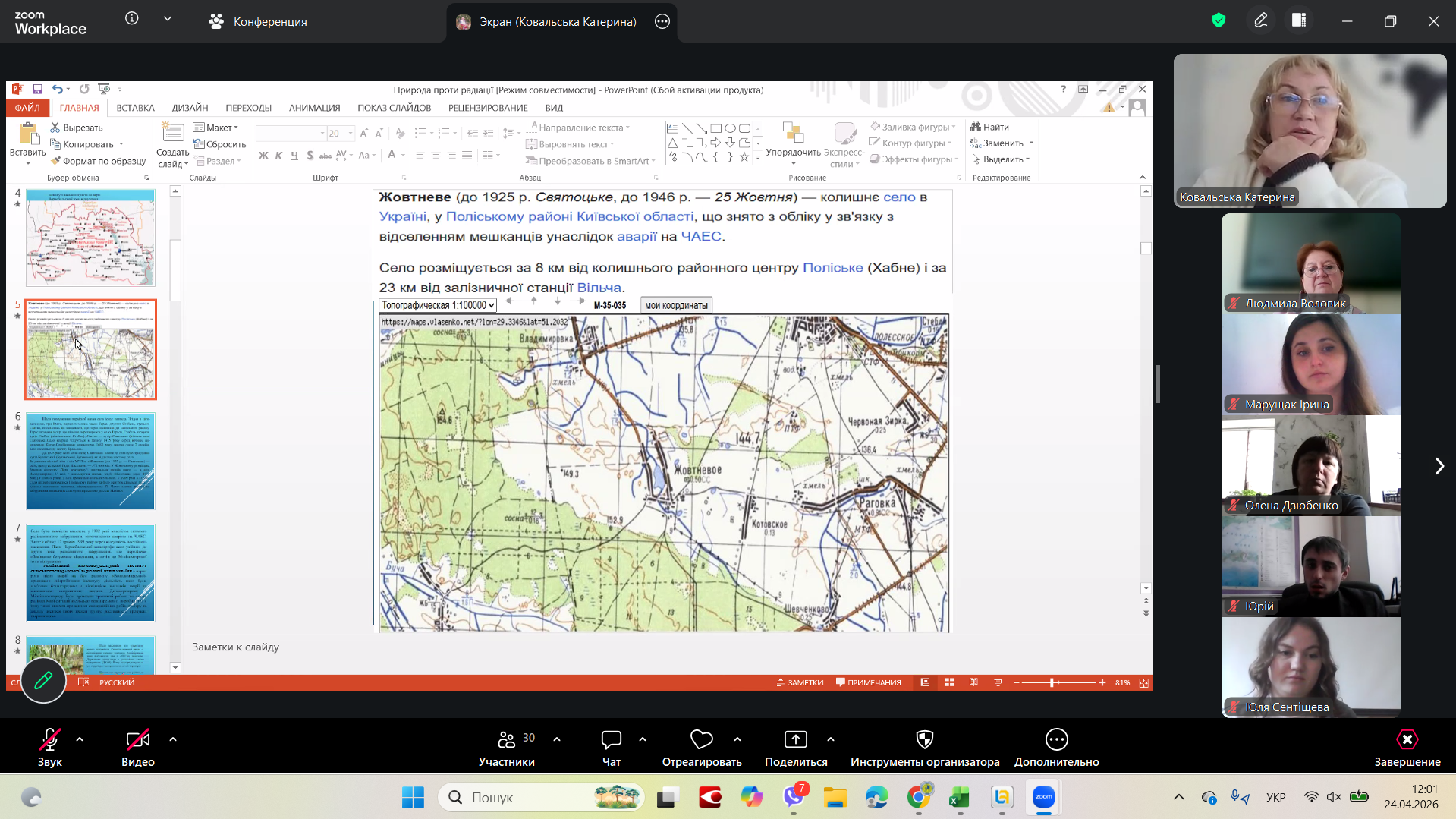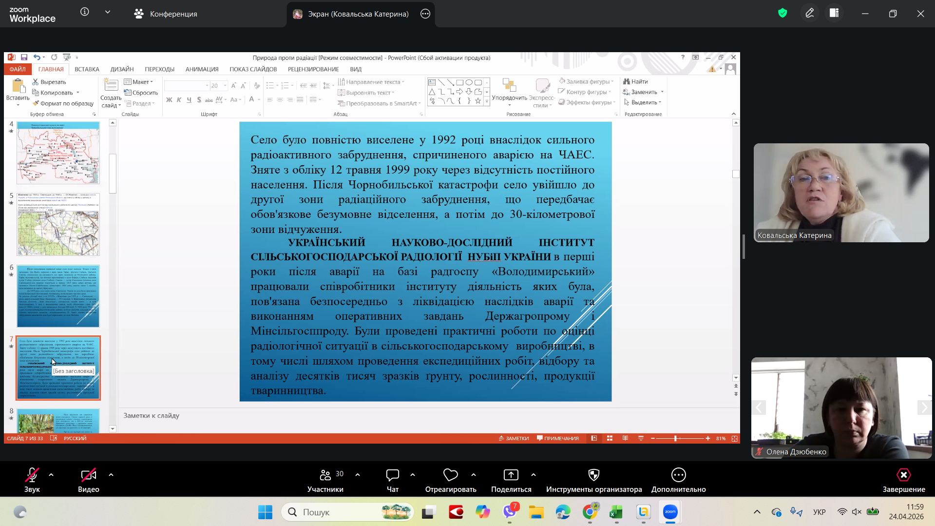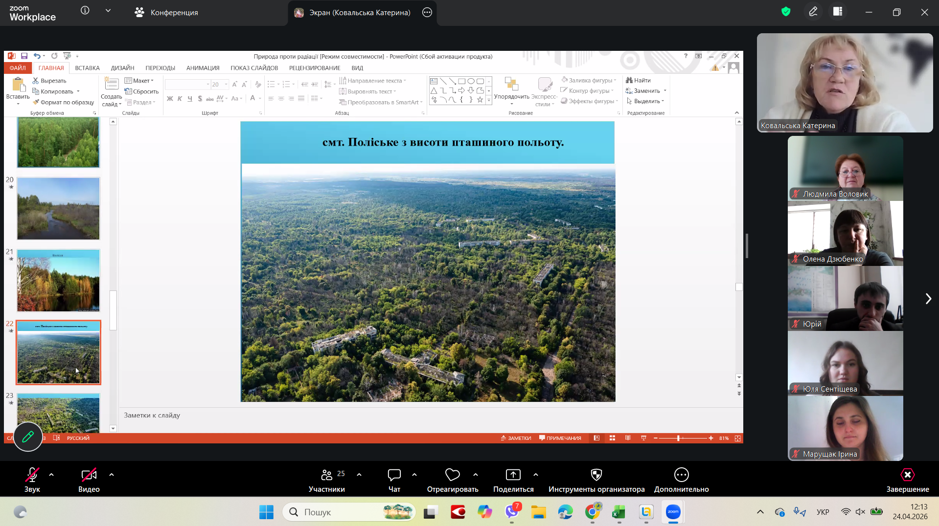 Своєю чергою, кандидатка географічних наук, доцентка та завідувачка кафедри екології, географії і методики навчання Університету Григорія Сковороди в Переяславі Людмила Воловик презентувала доповідь «Динаміка відновлення екосистем у зоні відчуження Чорнобиля», у якій детально розкрила природні процеси самовідновлення флори та фауни за умов мінімального антропогенного впливу.