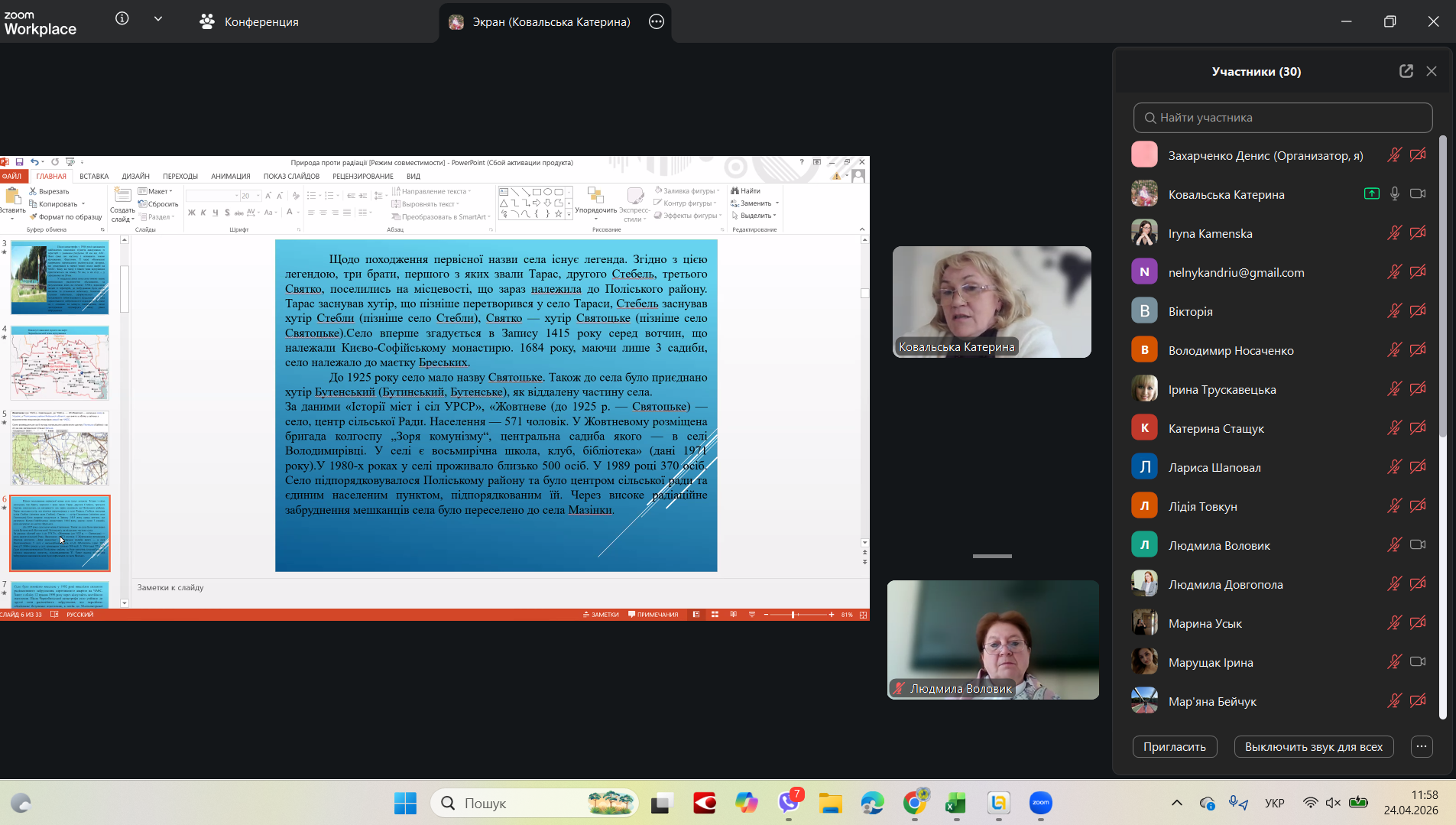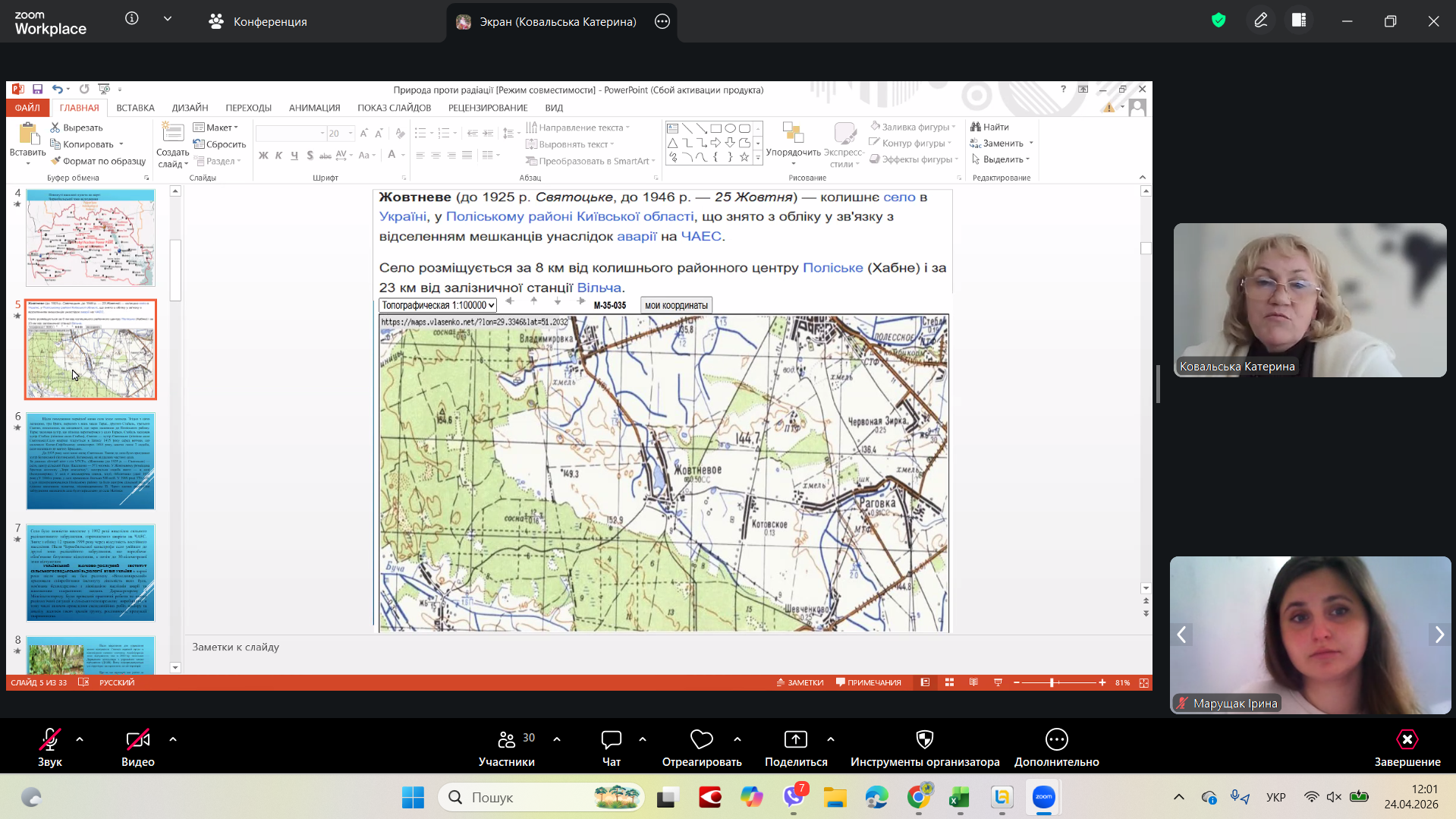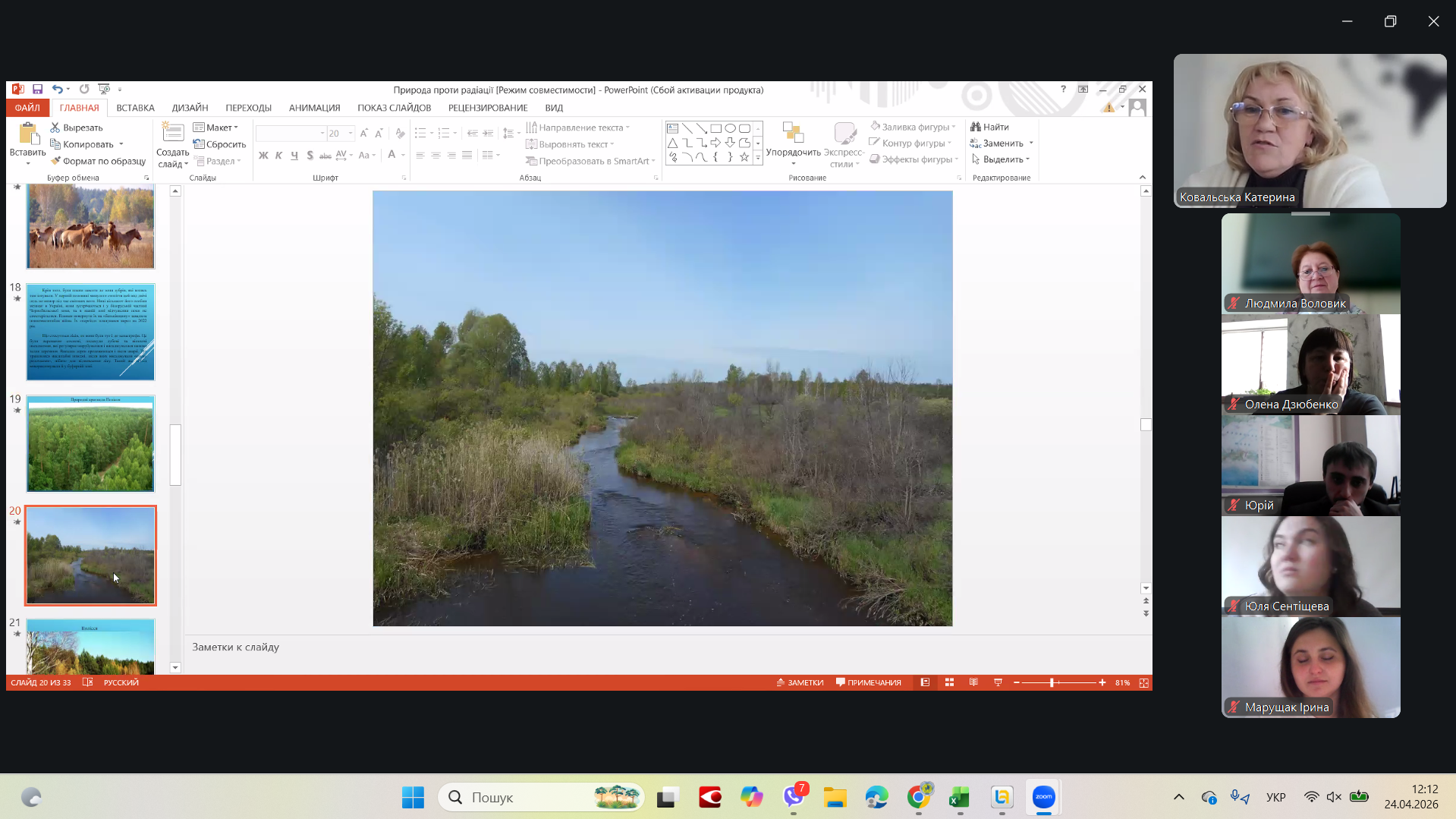 Своєю чергою, кандидатка географічних наук, доцентка та завідувачка кафедри екології, географії і методики навчання Університету Григорія Сковороди в Переяславі Людмила Воловик презентувала доповідь «Динаміка відновлення екосистем у зоні відчуження Чорнобиля», у якій детально розкрила природні процеси самовідновлення флори та фауни за умов мінімального антропогенного впливу.